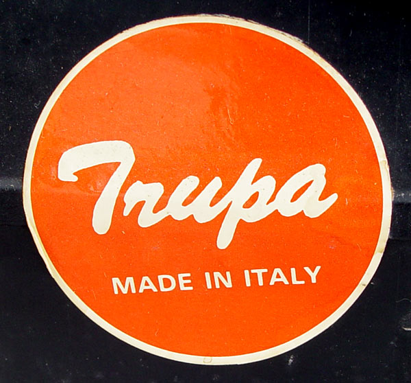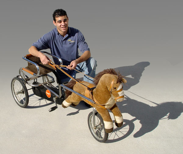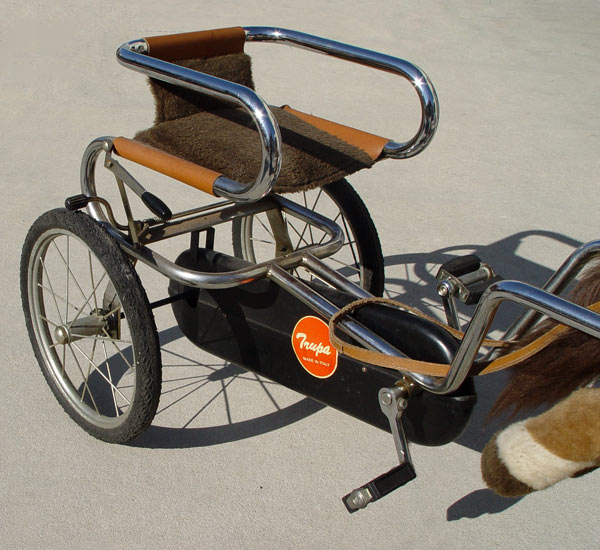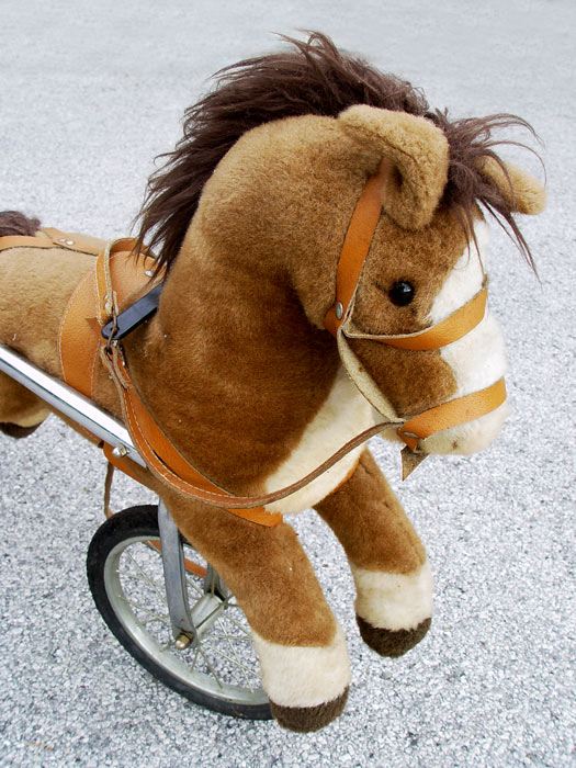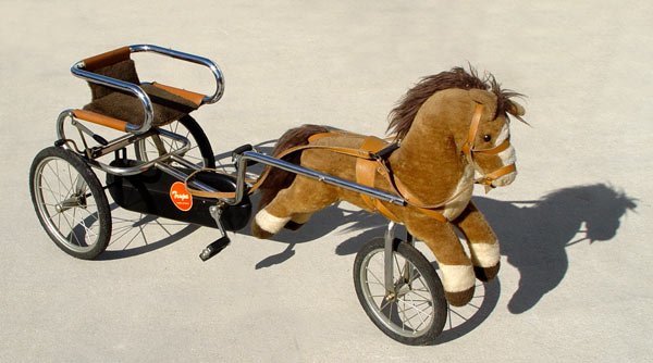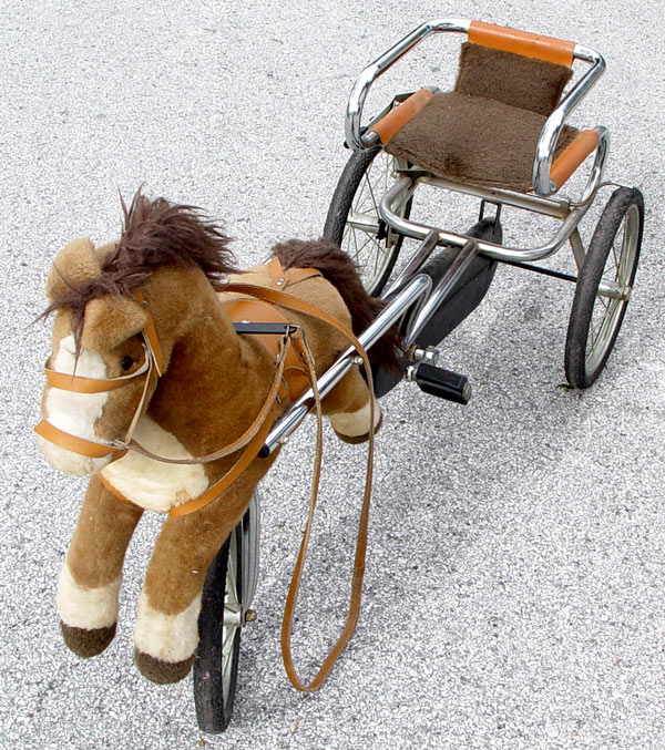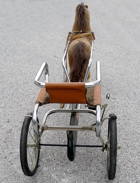 TRUPA CHILDS PEDAL CART WITH HORSE: Italian made three wheel pedal cart. A pull of the leather reins directs the front wheel. Rubber tires, steel frame. The horse is a plush type. 30'' tall overall, 56'' length, 18 1/2'' wide.