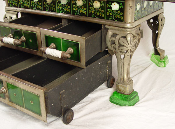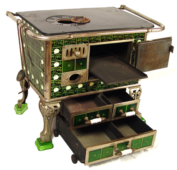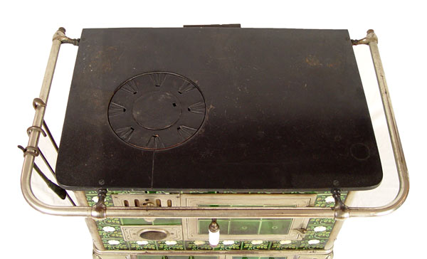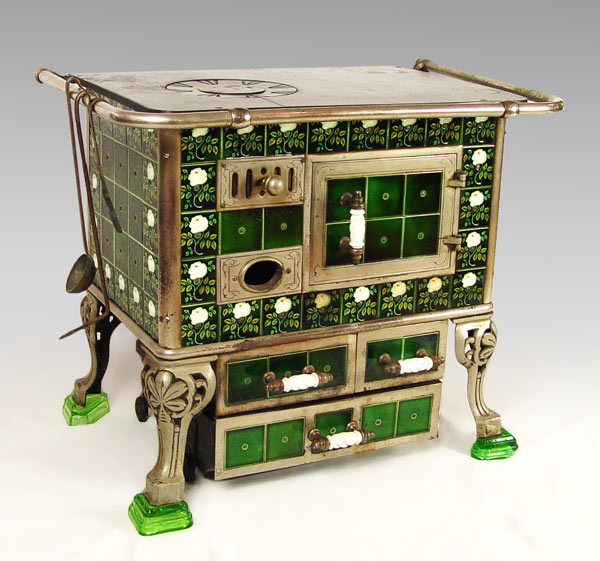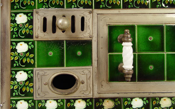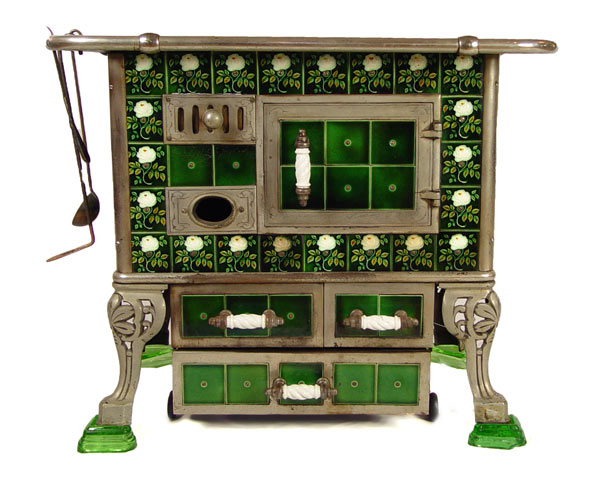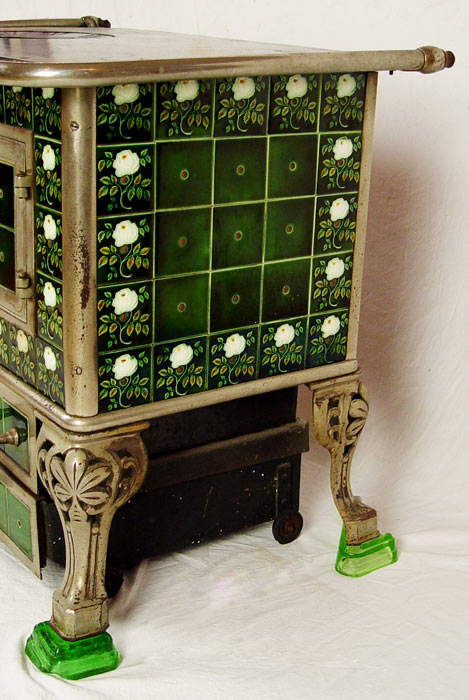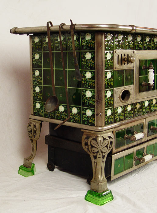 EUROPEAN TIN GLAZE TILED COAL BURNING STOVE: Tin glazed panel with floral designs. Cast iron top with nickeled steel tubes and body. Unique bottom drawer not attached to stove. Entire stove sits on 4 glass feet. Sold with ladle, poker and pot handle. Measures 30 3/4'' x 37 3/4'' x 25 3/4''.