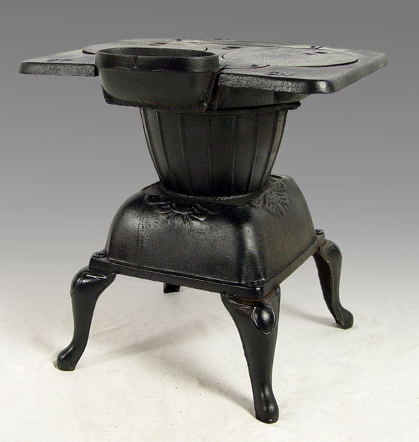 LITTLE JOE CAST IRON STOVE & KETTLE: Stove measures 20 1/2'' h. x 18 1/2'' x 20''. Kettle 7'' h x 12''.