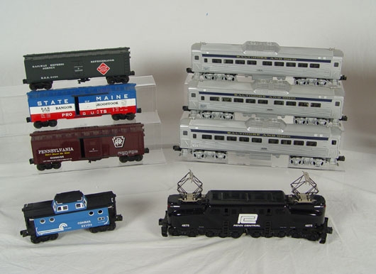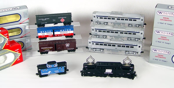 COLLECTION OF 8 ASSORTED WILLIAMS TRAINS IN BOXES: To include 1) #934875, Penn Central GG-1 Power A with horn. 2) #3259 State of Maine boxcar. 3) #3217 Classic Freight car Rea Reefer Refrigerator. 4) #3203 Pennsylvania boxcar. 5) N5C caboose Conrail stock cab 107-1/4''. 6) 3 rail viewing cars #420, 421, 422, Crown edition, Baltimore & Ohio