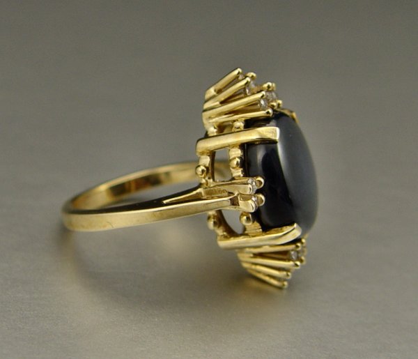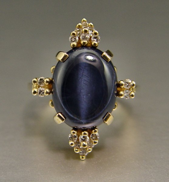 14K STAR SAPPHIRE & DIAMOND RING: 14K yellow gold ring contains one oval shaped cabochon cut blue star sapphire. Approx. 10.00 Ct. The sapphire is Diffusion treated. Thirty two round full cut and single cut diamonds. Weight: .48 Ct. Approx. Rated VS-SI in clarity and I-J in color. All stones are prong set. Weight: 7.8 grams. Size: 6.5
