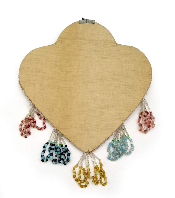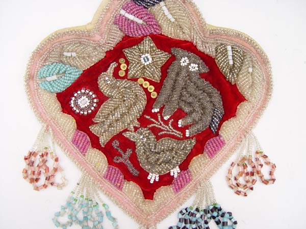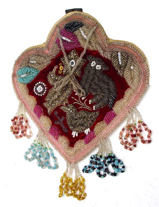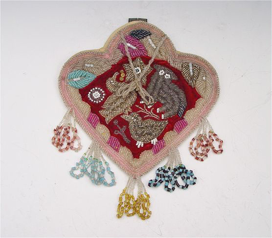 WOODLANDS NATIVE AMERICAN BEADED WALL POCKET: Heart shaped wall pocket with figural birds, animals, floral and dangles. Shades of pinks and red background. Reservation era, upstate New York, most likely produced for the tourist trade. Measures 9 1/2'' x 9 1/2''.