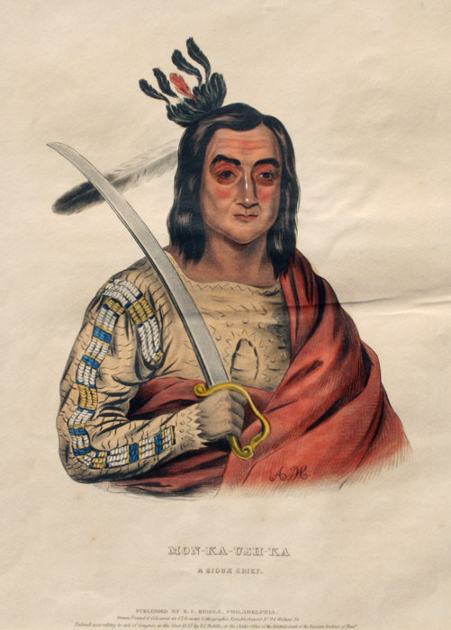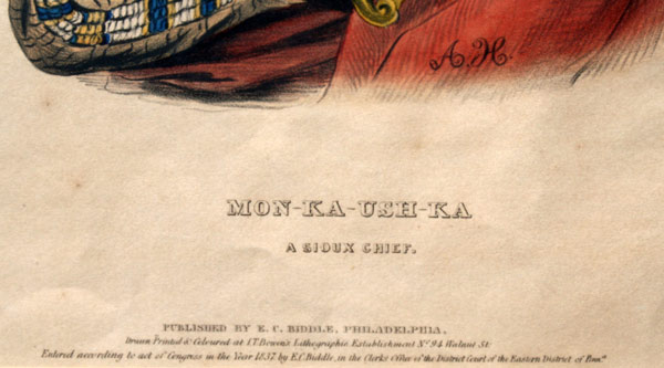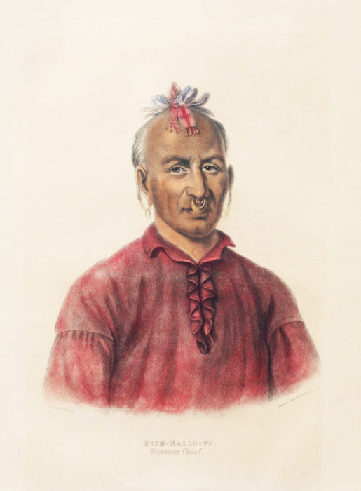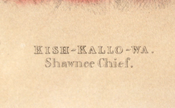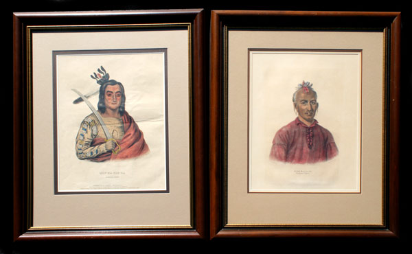 2 19TH C. AMERICAN INDIAN LITHOGRAPHS: KISH-KALLO-WA (Shawnee Chief), sight size 15 1/4'' x 11 3/4'', framed, 26'' x 21''; & MON-KA-USH-KA; (Sioux Chief), 15 1/2'' x 11 3/4'' sight size, framed, 27'' x 21 1/2''. (Some toning and minor foxing to both, Sioux has crease in mid margin, right side).
