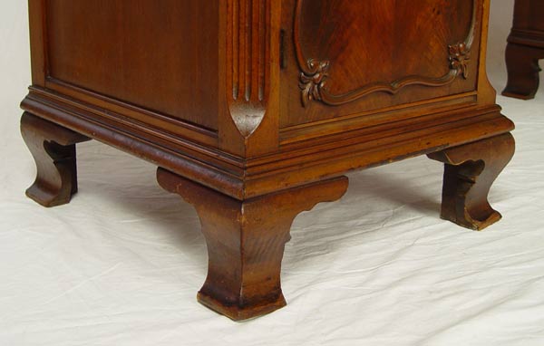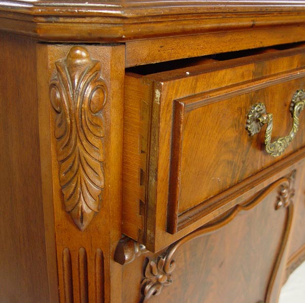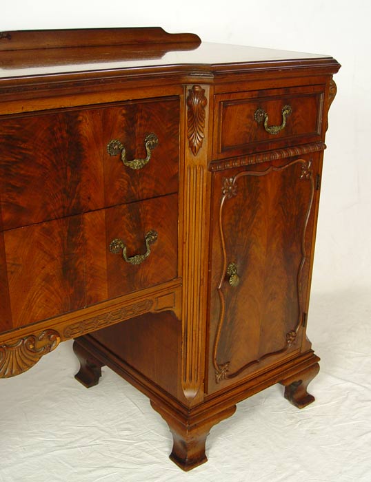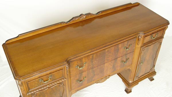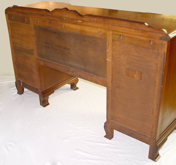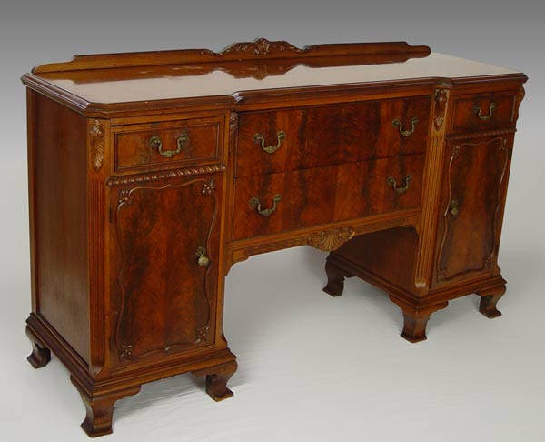 FINCH FINE FURNITURE DOUBLE PEDESTAL MAHOGANY SIDEBOARD: Unusual design of 2 deep drawers flanked by twin pedestals of drawers over doors. Fitted silver drawer. Applied decorative moldings, ogee bracket base. 40'' tall, 66'' length, 20 1/2'' deep. Finish in need of TLC.