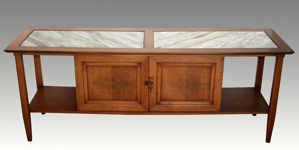 MID CENTURY LOW CREDENZA: Top with marble inserts. 26 1/2'' h. x 66'' x 18''