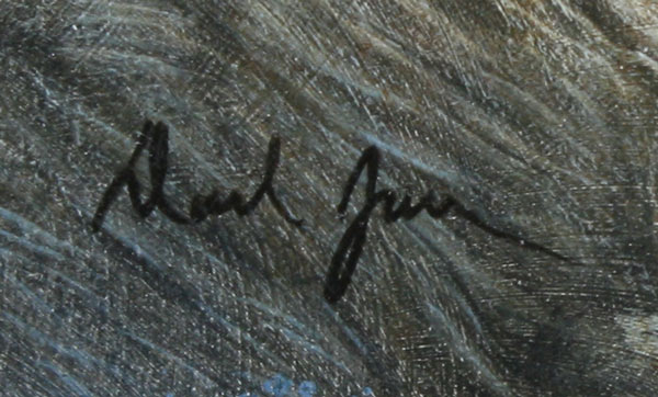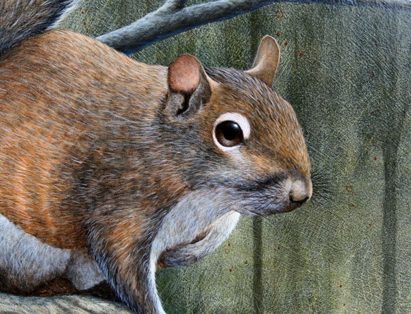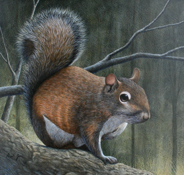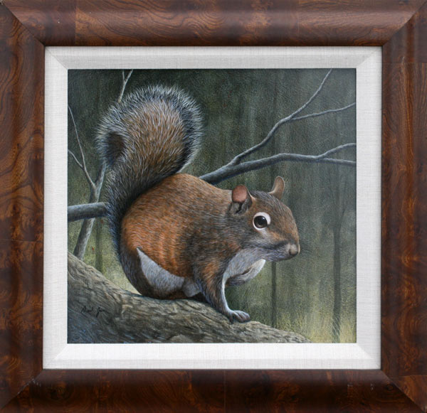 JONES, David, (American, 20th C.): Squirrel, OIL/Board, 12 7/8'' x 13 3/8'', signed, burlwood frame, 19'' x 19 1/2''.