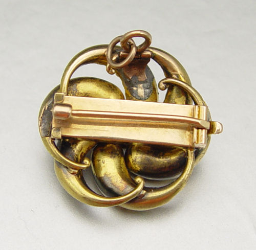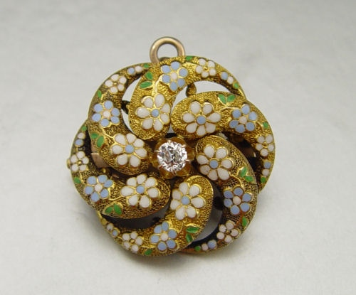 18K ENAMELED DIAMOND BROOCH/PENDANT: 18K yellow gold pinwheel brooch with blue green and white enameled floral design. One old mine cut diamond. Weight: .18 Ct. Approx. Rated VS in clarity and H-I in color. The diamond is prong set. Pivot bail and removable bar pin. Weight: 8.6 grams. Approx. 1'' in diameter.