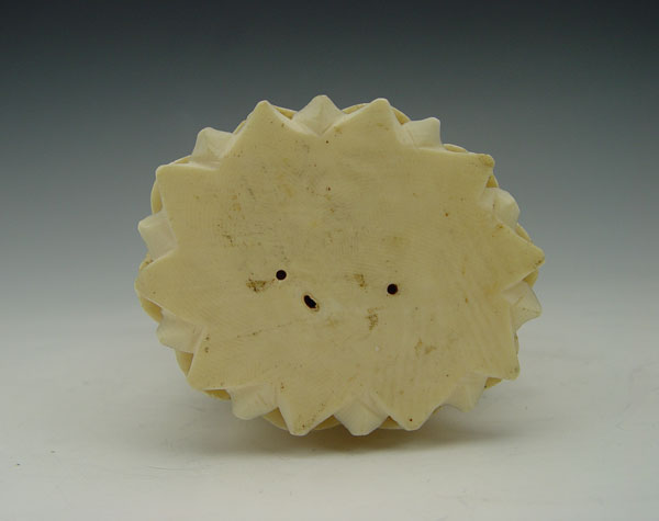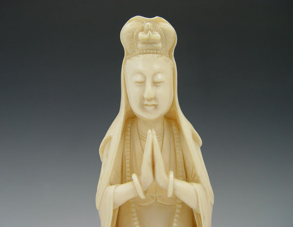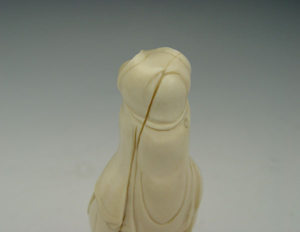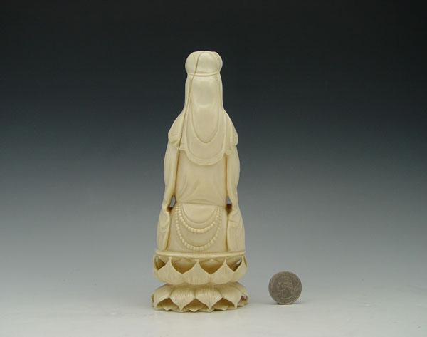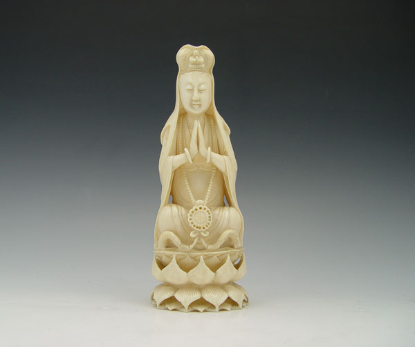 JAPANESE CARVED IVORY FEMALE ON LOTUS BLOSSOM: Seated female with prayer beads and medallion. Measures 7 1/2'' x 2 3/4'' dia..