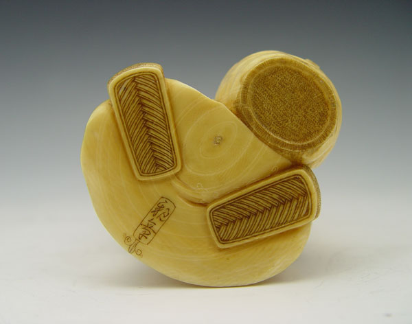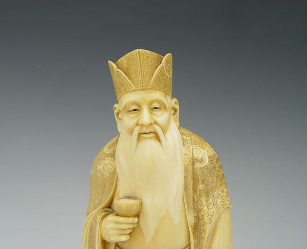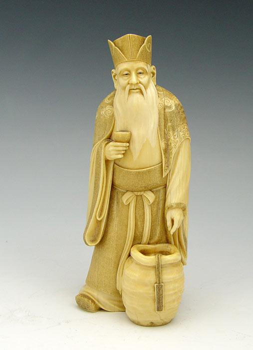 CARVED IVORY FIGURE OF A WISE MAN: Carved from single piece, finely detailed figure of a man with long beard. Intricate design on robe and hat, man folding cup with basket at feet. Signed in characters on base. 6''