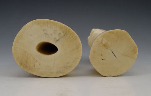 2 PIECE AFRICAN CARVED IVORY FIGURES: To include 1) Bust of man with ponytail hair. Note split on top of head, chips on ears. 5 1/2'' h. 2) Bust of a woman with elongated ears. Note fill in top. 5 1/4'' h.