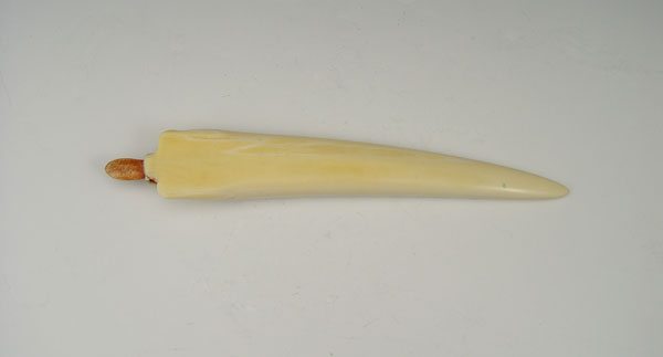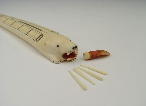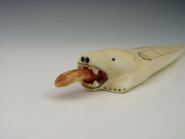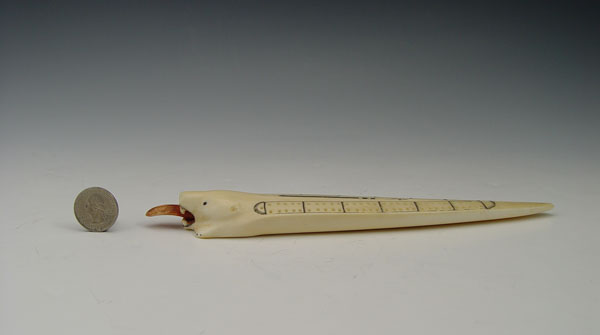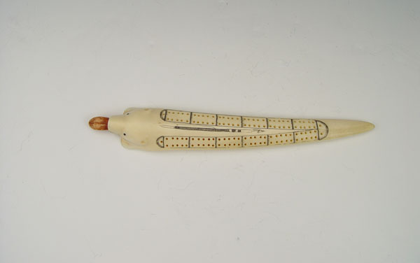 ALASKAN IVORY CRIBBAGE BOARD: In the form of a polar bear with scrimshaw design. With pegs. 9 1/4'' long.