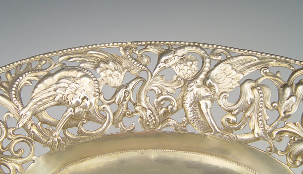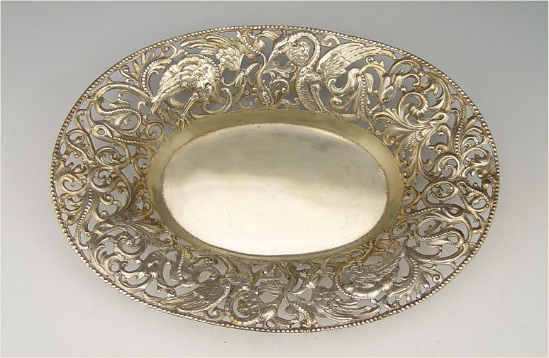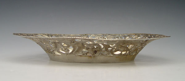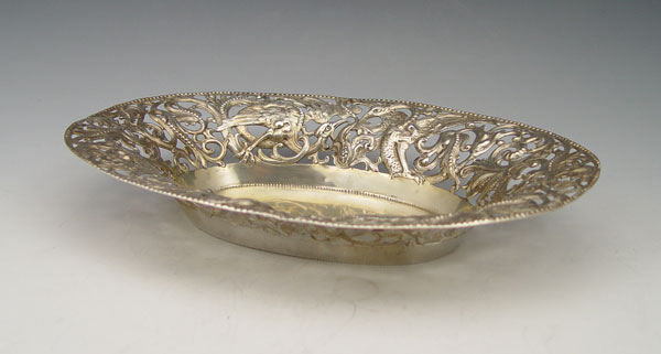 GERMAN SILVER RETICULATED BIRD DESIGN TRAY: Tray with openwork and embossed sides featuring figural birds, floral and scroll design. German 800 silver hallmarks, no maker's mark. Measures 1 5/8'' h. x 10'' x 7 1/4''. Approx 8.2 troy oz.