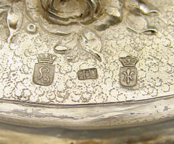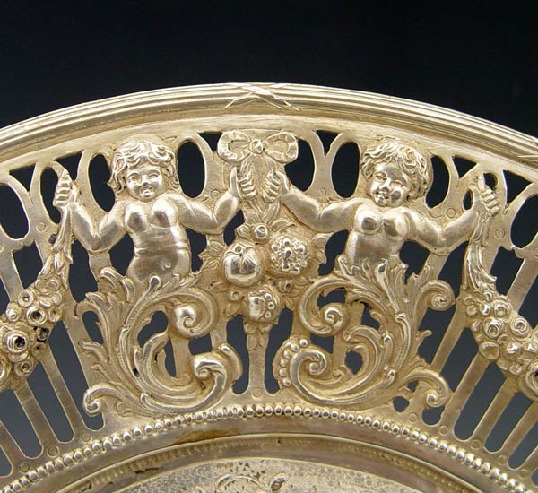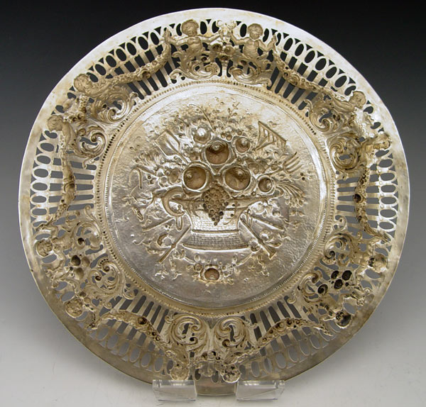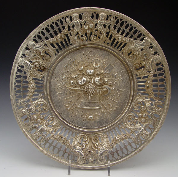 HANAU SILVER FLORAL EMBOSSED RETICULATED CHARGER: Openwork sides with embossed putti and floral swag decoration. Embossed fruit basket center. Marked with 800 and unknown Hanau makers hallmarks. Measures 3/4'' h x 10 7/8'' dia. Approx. 14.7 troy oz.