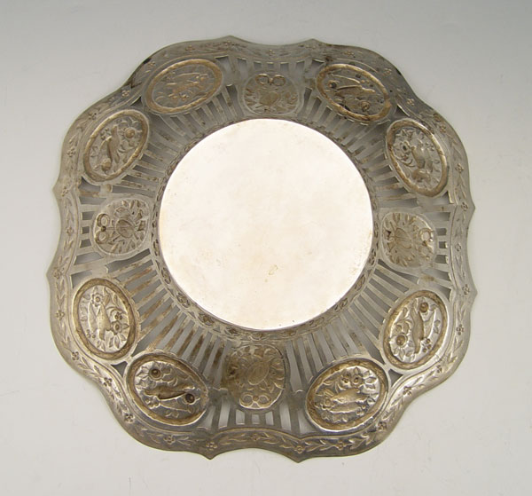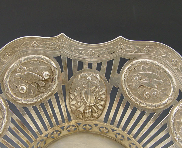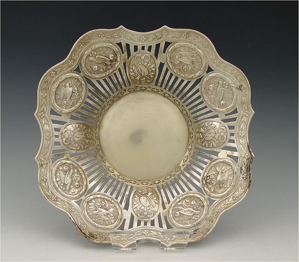HANAU SILVER RETICULATED BOWL WITH MEDALLIONS: Open work bowl with medallions featuring birds, floral, and instruments. Hallmarked 800 with Hanau marks and unknown maker F.S.. Measures 2 1/4'' h x 10 3/4''. Approx. 10.6 troy oz.