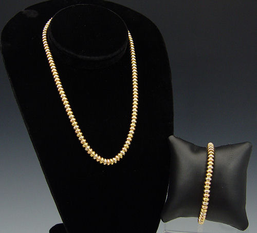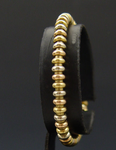 18K TRI COLORED GOLD NECKLACE CONVERTS TO A BRACELET: 18K tri colored gold necklace with rondelle style expandable links measuring approx. 6.00 mm. 24'' in length. Will convert to a 16 1/2'' necklace with an 8'' bracelet. Hidden clasp weight: 69.0 grams.