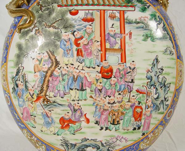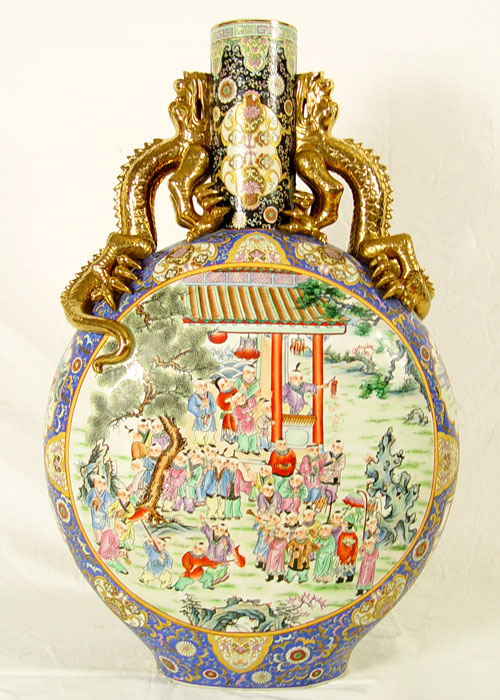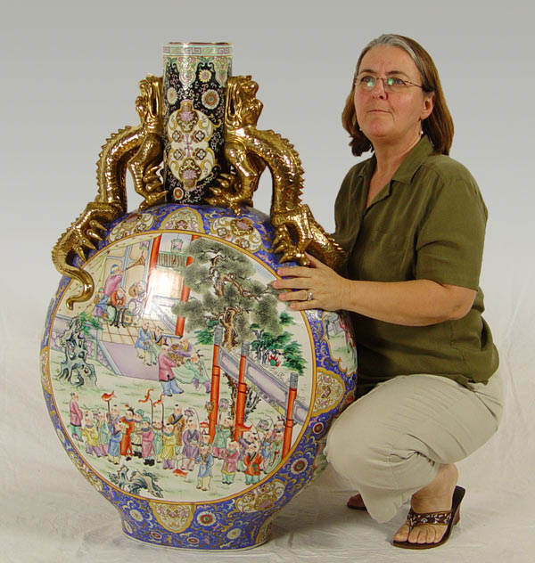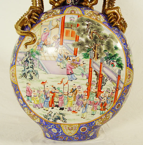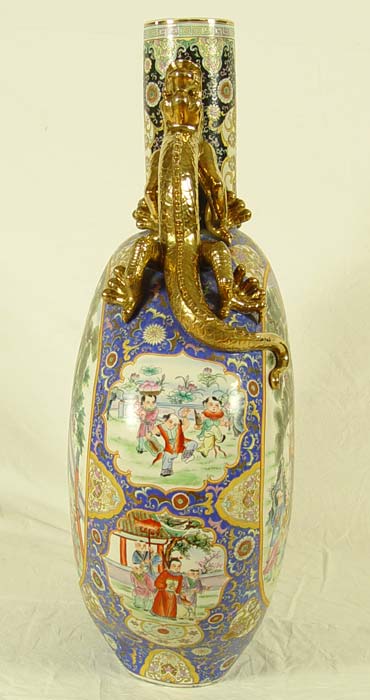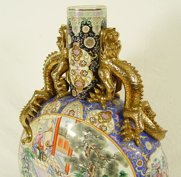 MEDALLION PALACE VASE: Polychrome porcelain floor vase with double lizard handles of gold gilt, 42''h. x 27'' x 12''.
