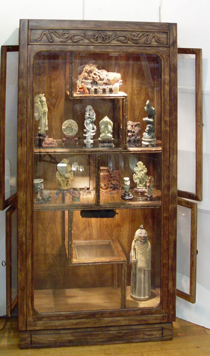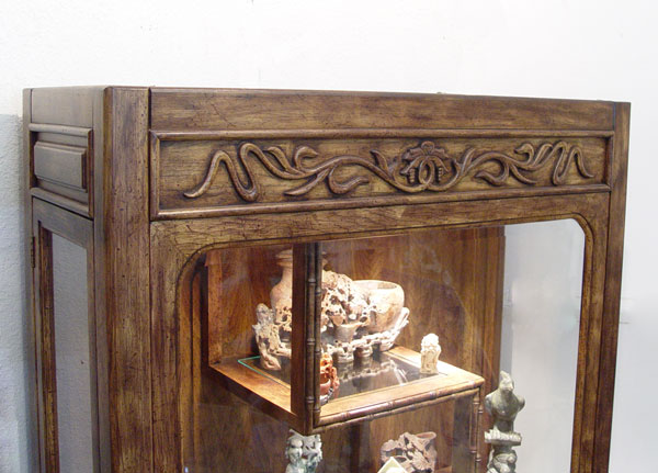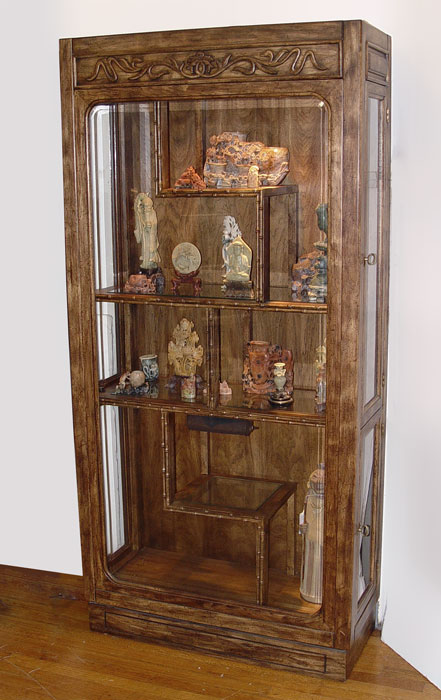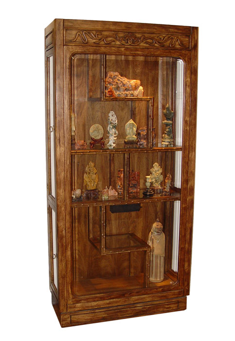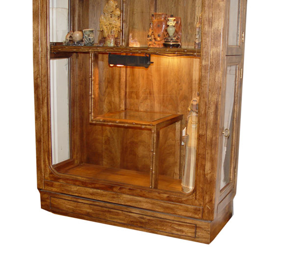 CONTEMPORARY CHINESE STYLE CURIO DISPLAY CABINET: Lighted interior, asymmetrical stacking of shelves. Faux bamboo trim. Glass side opening doors. 75 1/2'' tall, 36'' wide, 15'' deep.