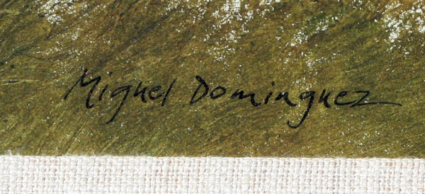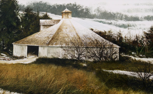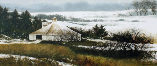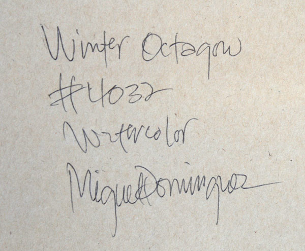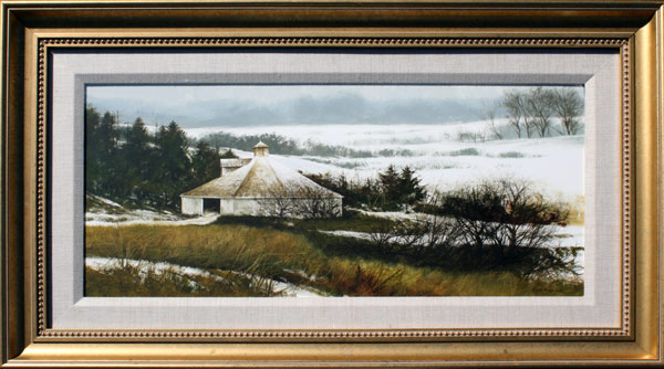 DOMINGUEZ, Miguel, (American, 1941-): Winter Landscape with Barn, Watercolor, sight size 12'' x 27'', signed, impressive contemporary gilded frame, 20'' x 35''.