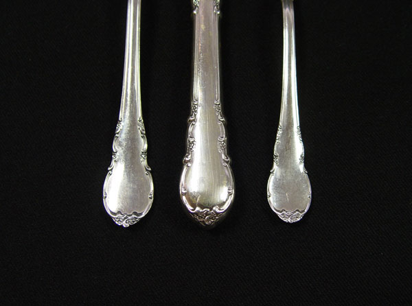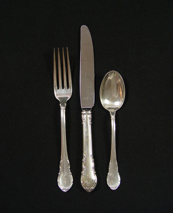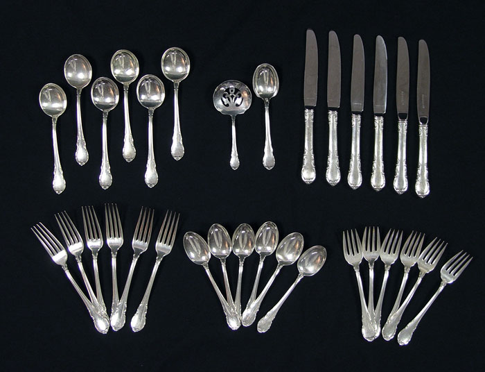 LUNT MODERN VICTORIAN STERLING FLATWARE SET: Setting for 6 with approx. 32 pieces in the Modern Victorian pattern by Lunt to include 6 forks (7 1/4''), 6 salad forks (6 3/8''), 6 teaspoons (6''), 6 oval soup spoons (6 1/4''), 6 hollow knives (8 3/4''), sugar scoop (5 3/4''), bon bon server (5''). No monograms. Approx. 34.2 troy oz.