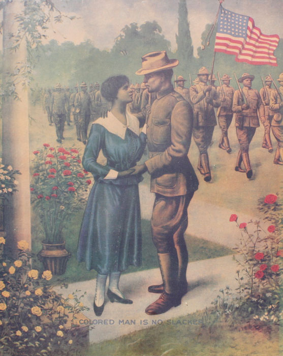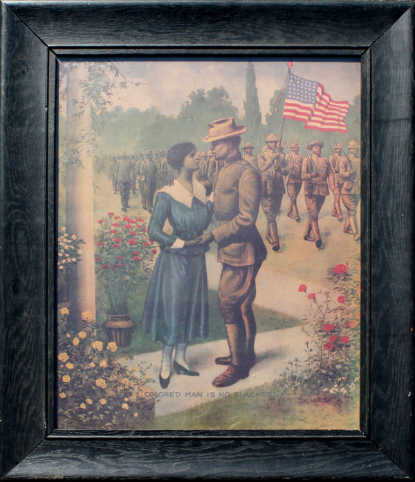BLACK AMERICANA WWI CHROMOLITHOGRAPH: ''The Colored Man is No Slacker'', sight size 19 1/2'' x 15 1/2'', ebonized oak frame, 25'' x 21 1/2''.