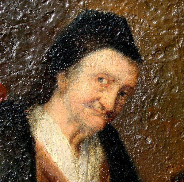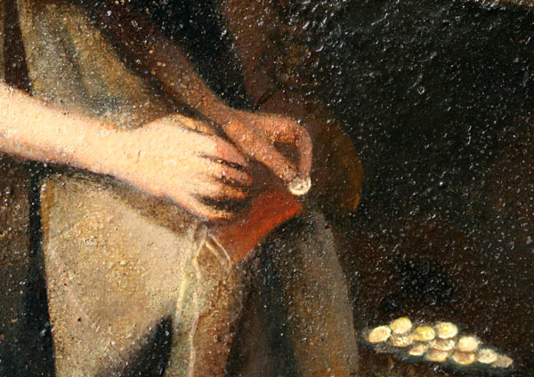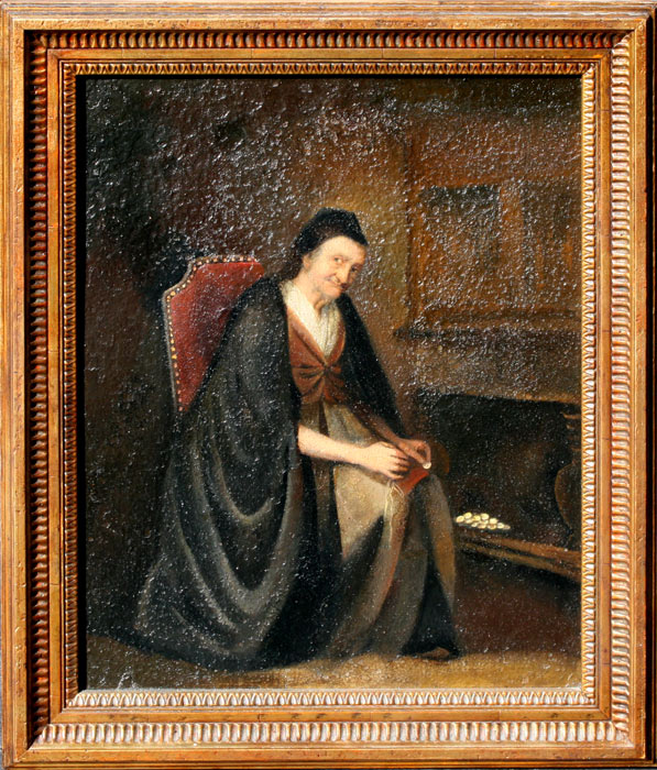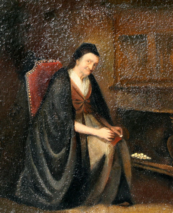 EARLY PAINTING OF ELDERLY WOMAN WITH COINS: OIL/Canvas, 20'' x 16', very nice detail in face, no visible signature, framed, 24'' x 20''.