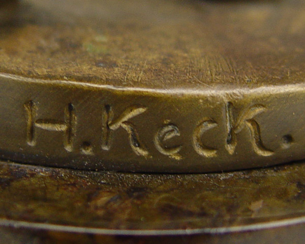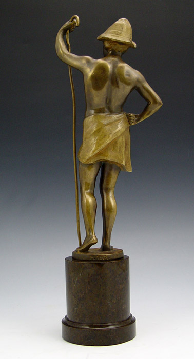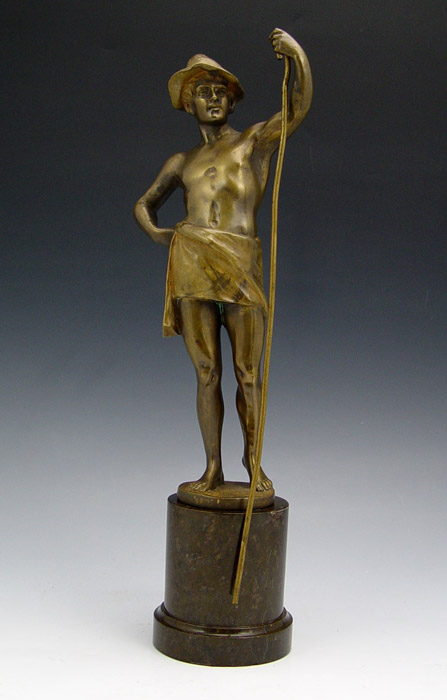 KECK, Hans, (German, 19th/20th C.): Man with Staff, Bronze figure measures 9 3/4'' h, 13 3/4'' h. overall on marble plinth (with small chips).