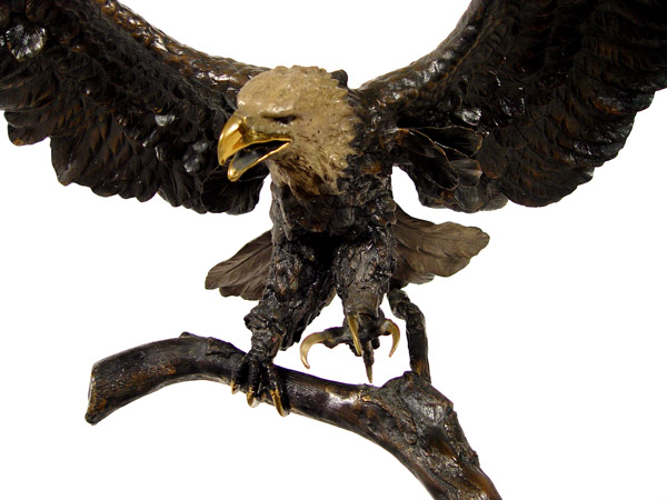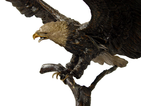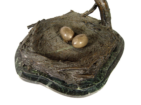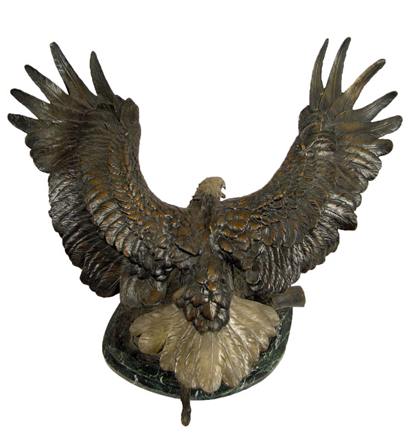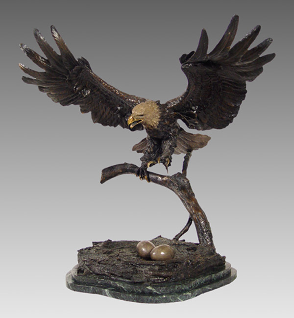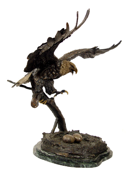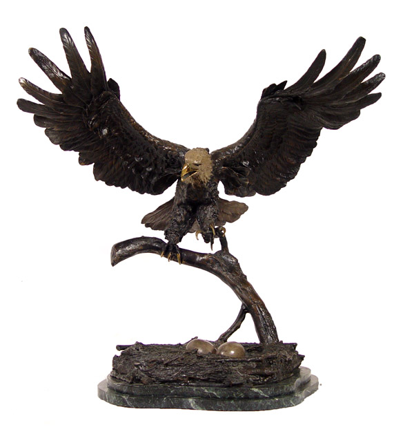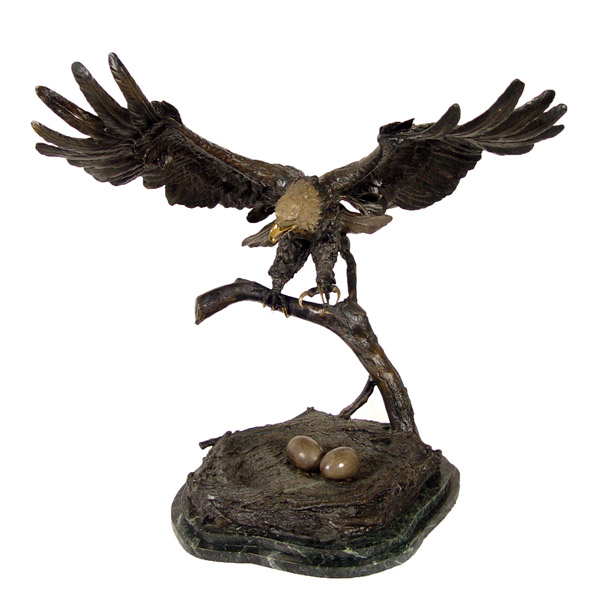 LARGE BRONZE EAGLE LANDING ON NEST: Unsigned, Eagle landing on nest with 2 eggs. on Marble plinth. Measures 30 1/4'' x 33 1/4'' x 33'' overall on plinth.