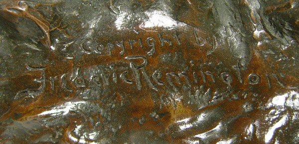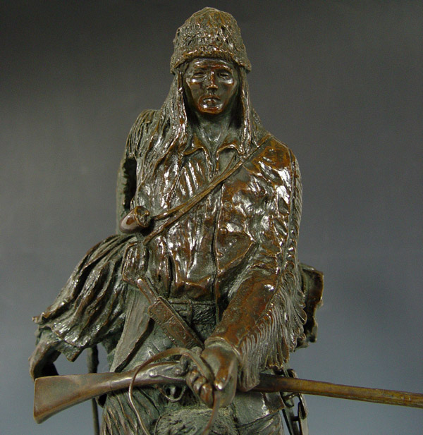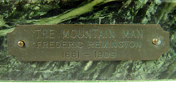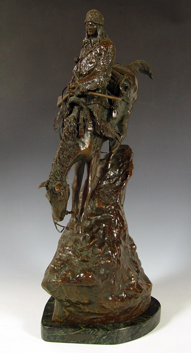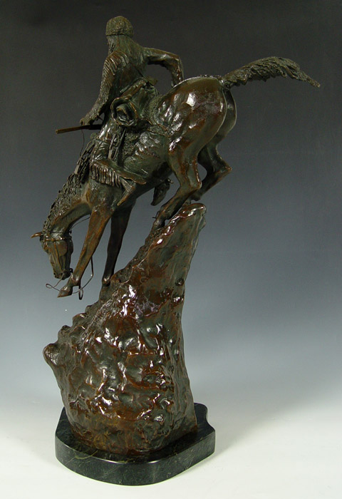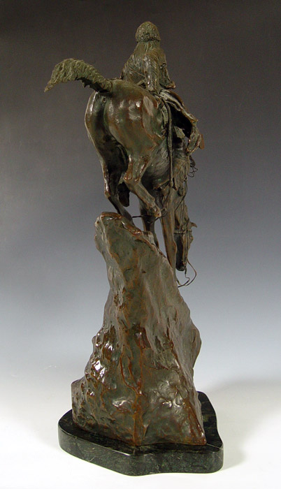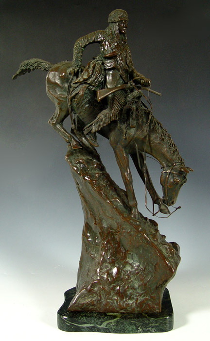 AFTER REMINGTON MOUNTAIN MAN BRONZE: After Frederic Remington, ''Mountain Man'' on marble plinth. Measures 29 1/2'' x 21'' x 11 1/2'' overall on plinth.