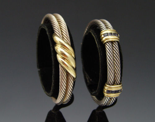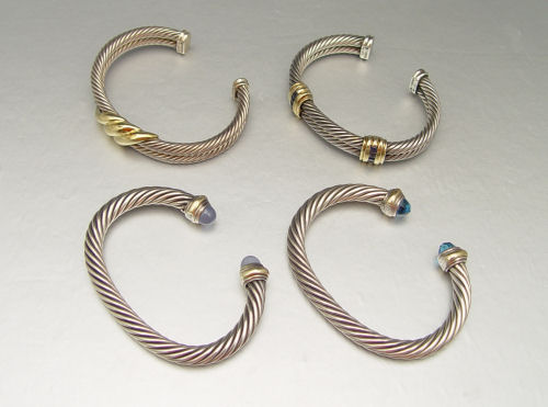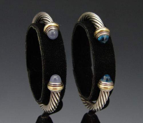 GROUP OF 4 DAVID YURMAN CUFF CABLE BRACELETS: Sterling silver with 14K yellow gold accents with blue topaz, iolite, and chrysoprase stones. Weight 181.9 grams.