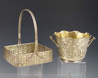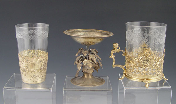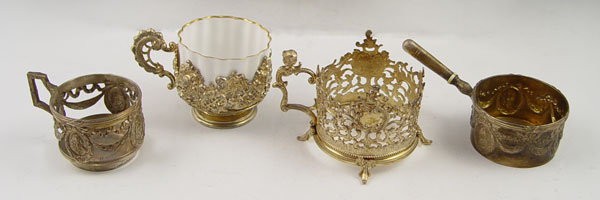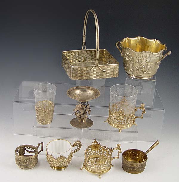 9 PIECE COLLECTION OF CONTINENTAL SILVER: 1) William Binder German 800 silver handled basket. 6 1/2 h. x 5 1/4'' square. 2) Muller 800 German silver embossed floral 2 handled bowl. 3 3/8'' h x 5 3/4''. 3) Austrian 13 loth (.812) silver stand with grapes & leaves decoration. Illegible date & makers mark.3 1/2''h. x 3 1/4''. 4) Simon Rosenau 800 German silver demitasse cup, embossed portraits in medallions, (missing insert). 2'' x 2 3/4''. 5) Simon Rosenau 80 German silver handled creamer. Embossed portraits in medallions. 1 3/4'' x 4 5/8''. 6) Unknown German 800 silver maker reticulated coup holder with cherubs. Glass insert may be replacement as it is loose. 3 3/8''h x 1 7/8'' dia. overall. 7) Illegible German 800 silver makers reticulated demitasse cup with porcelain insert. Insert may be replacement, does not sit correctly. 2 3/8'' x 3 1/2''. 8) 2 piece reticulated handled cup holders with cherub handles. One missing insert, unmarked as to maker or metal content and included as decorative items. Approx 22.