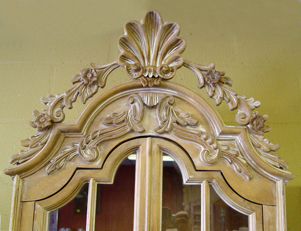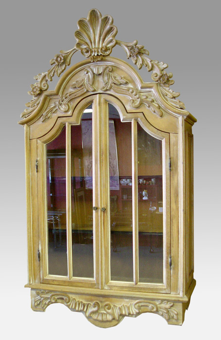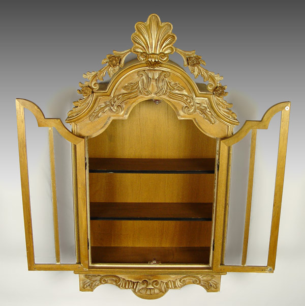 CARVED ITALIAN PICKLED PINE HANGING CUPBOARD: Two door hanging display cupboard with two wooden shelves. Carved Shell and branch atop arched pediment . Georgian style replication with panel sides. Measures 47'' h. x 26'' x 9 1/2''.