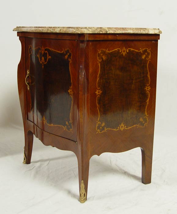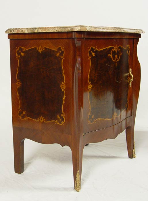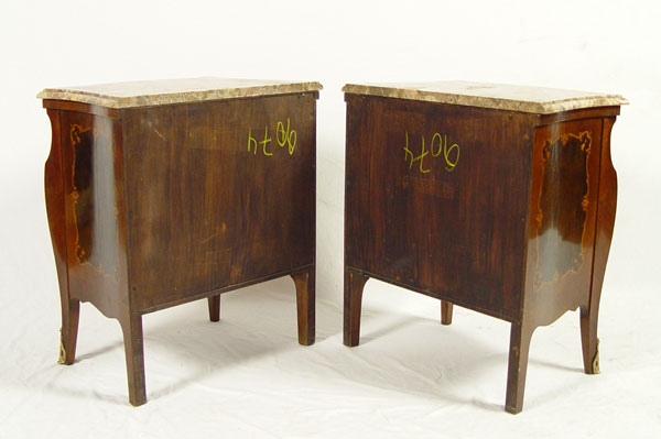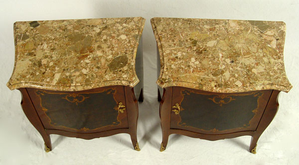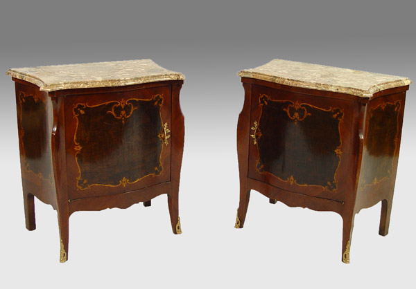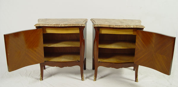 PAIR FRENCH MARBLE TOP COMMODES: Inlay stands, single door, interior shelf. Shaped and beveled mirror. 26''h. x 24'' x 15''.