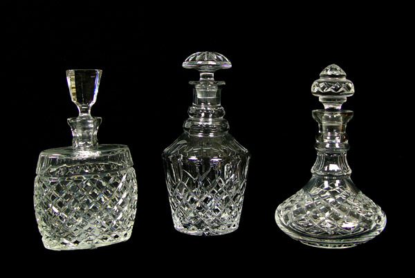 3 CRYSTAL DECANTERS: Waterford quality, approx. 10'' tall, including stopper.