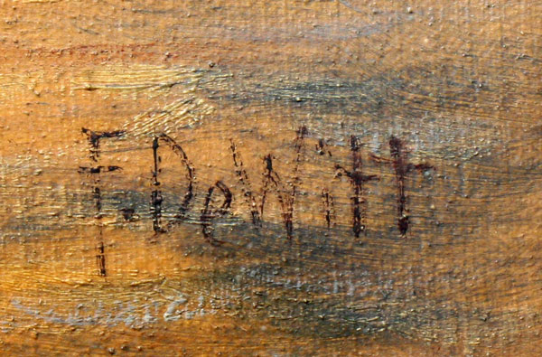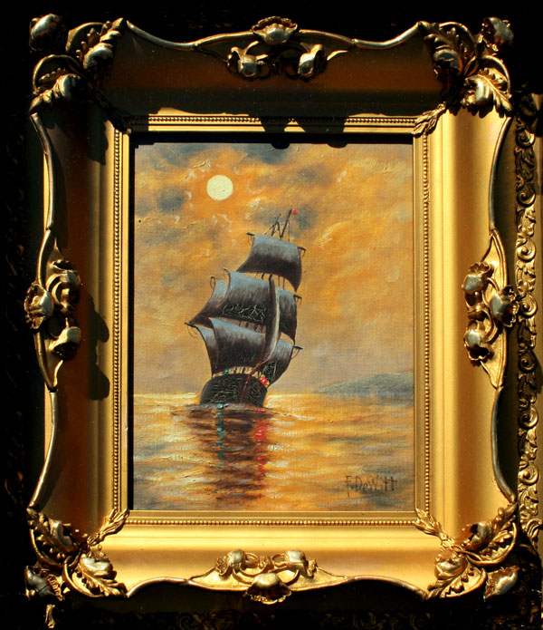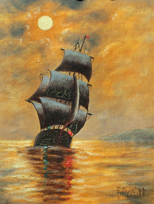 MOONLIT CLIPPER SHIP OIL/CANVAS SIGNED F. DEWITT: 12'' x 9'', shadowbox containing gilded frame, 20'' x 18'', circa 1900.