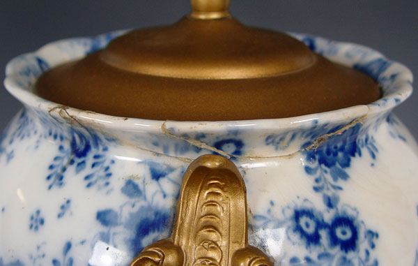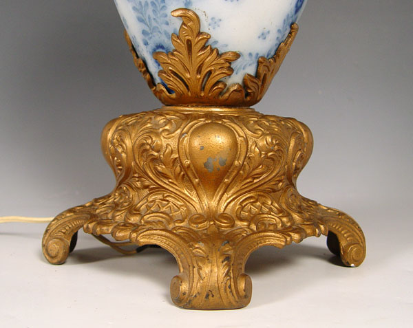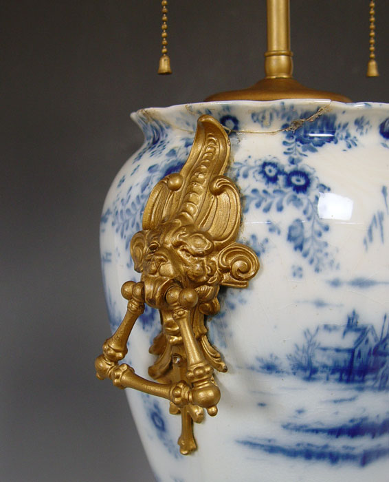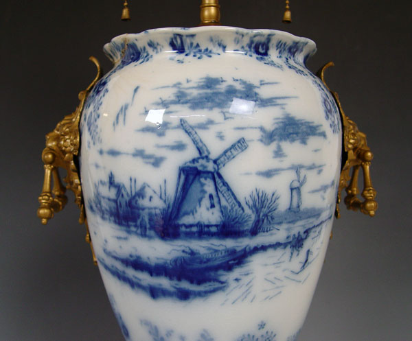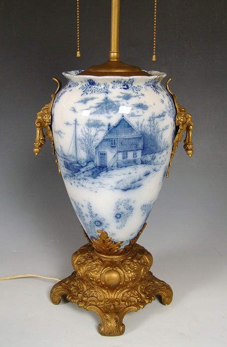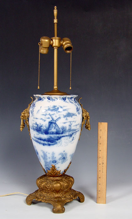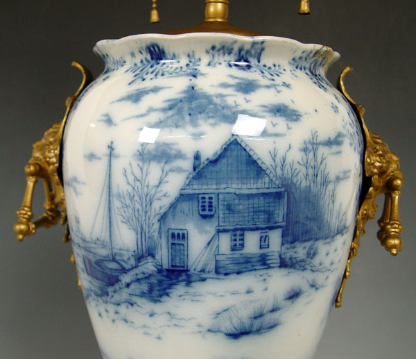 FINE PORCELAIN LAMP: Cobalt decorated Dutch landscape, metal masqueron mounts and base. Lamp is 31'' to finial. Please note repair to rim.