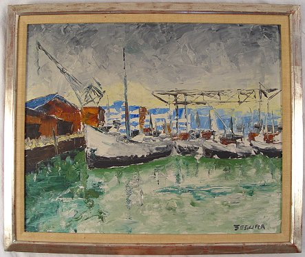 SEGURA, Jean Pierre, (French, 20th Century): Harbor Scene with boats, Oil/Canvas, 20'' x 24'', signed lower right, silver gilt frame, 23'' x 27''. International Galleries Chicago label affixed verso sold with translated artist info from back of the painting.