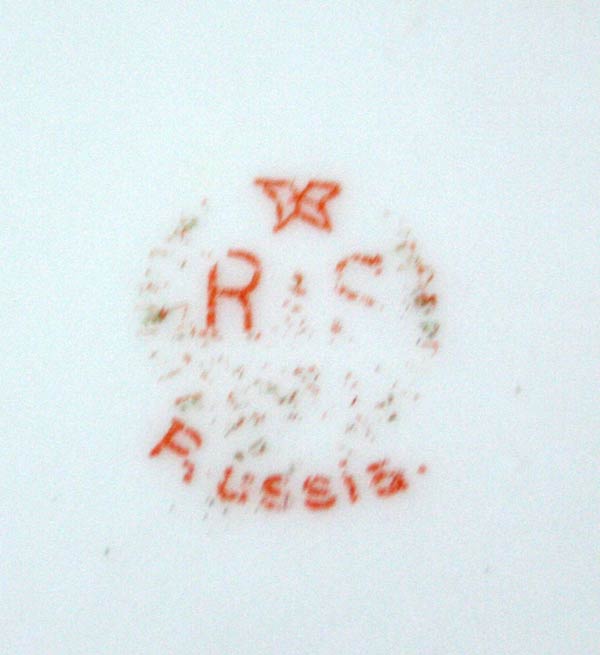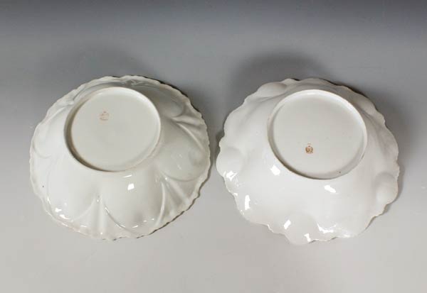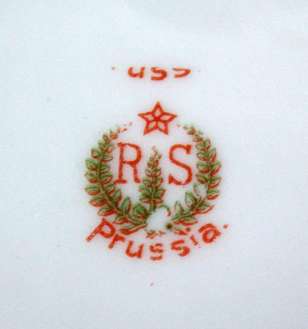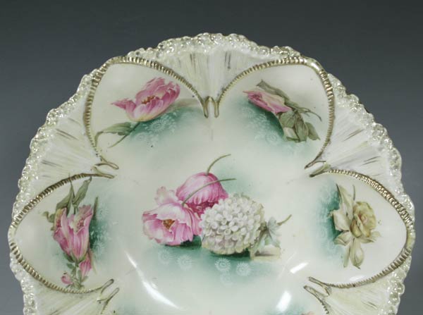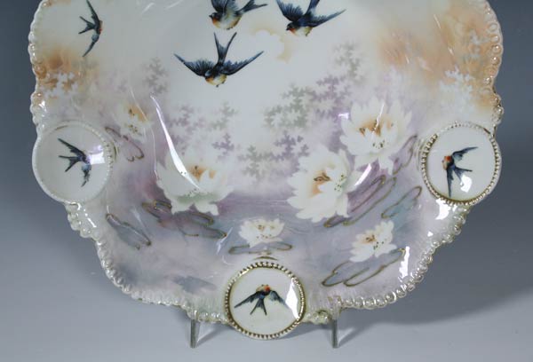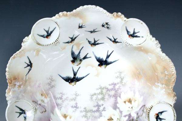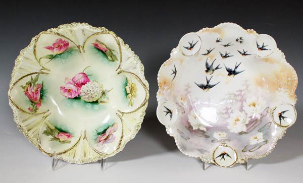 TWO RS PRUSSIA PORCELAIN BOWLS: Iridescent bowl with birds in flight, 11'' dia. and Flower decorated bowl, 10 1/2''.