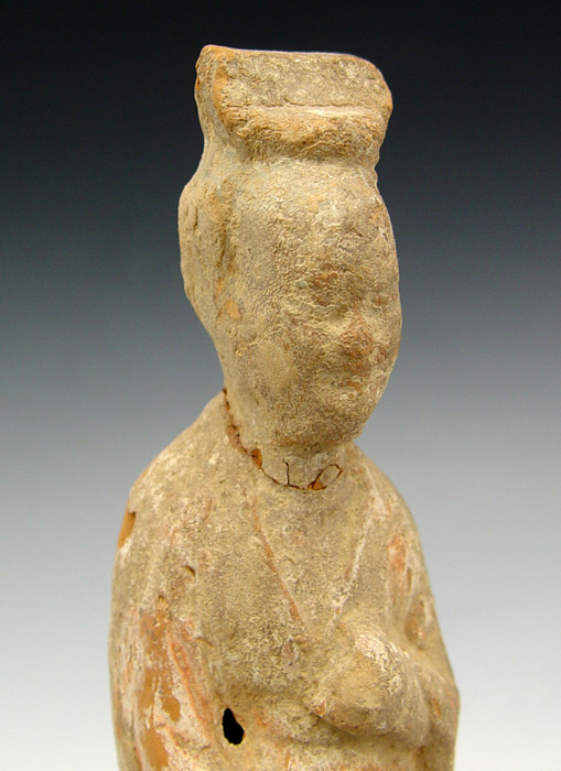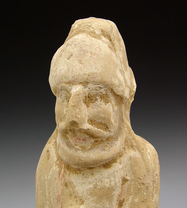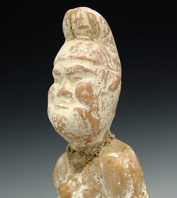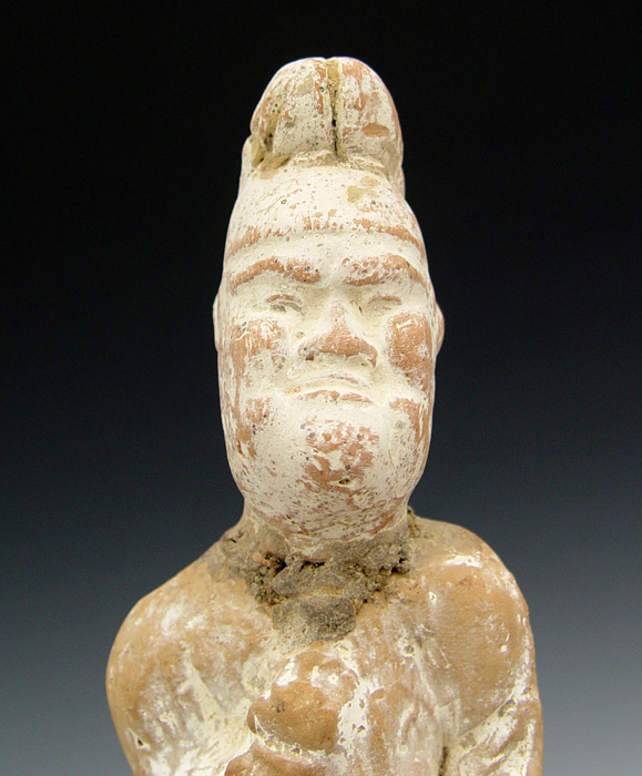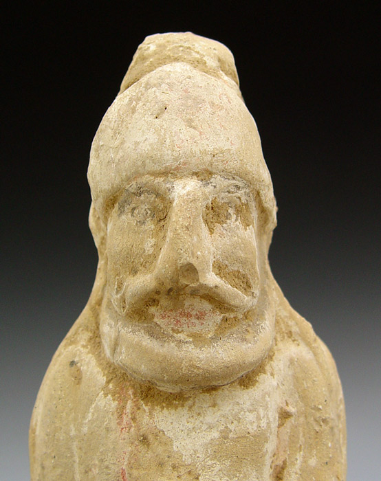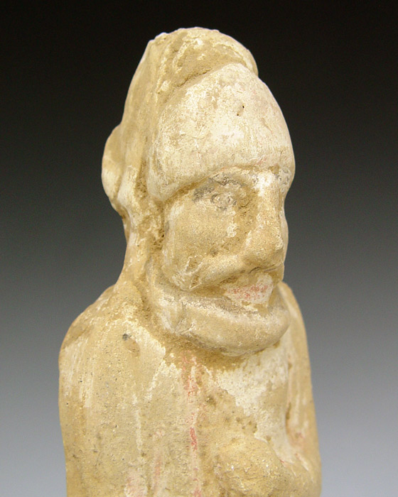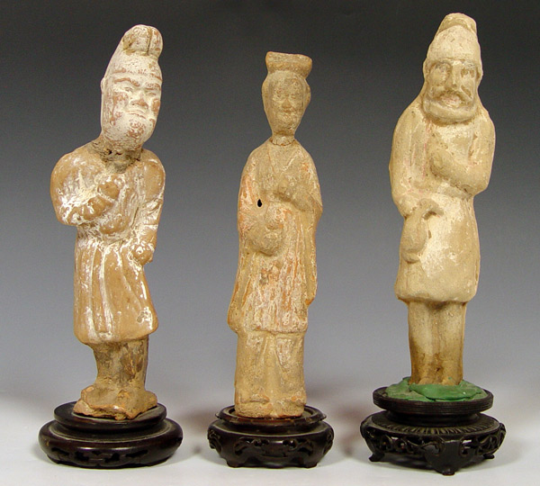 3 PIECE CHINESE HAN DYNASTY PAINTED POTTERY FIGURES: Circa 206-220 BC, all painted red pottery, to include 1) Figure of a groom, he is wearing a belted coat and leggings strapped under his feet. Affixed to rosewood base. 11'' high overall. 2) Figure of attendant with robe and leggings. Note hole and repair at neck. Affixed to rosewood base. 10 3/4'' high. overall. 3) Figure of a foreign attendant wearing a beard and is holding a vessel in his right hand. Affixed to rosewood base with green museum clay, loose on base. 11 1/2'' overall. All pieces retain traces of original paint. From the Estate of Dr. Arthur England, renowned author, lecturer and museum consultant.