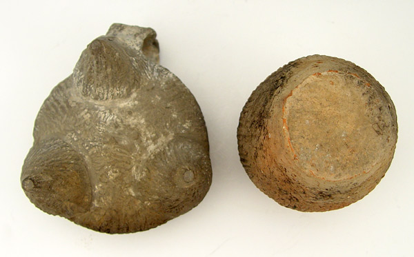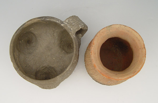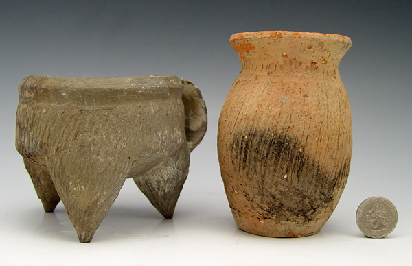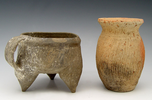 2 PIECE SHANG DYNASTY CHINESE STEAMER & VESSEL: Circa 17th - 14th century B.C. to include 1) Grey wear tripod steamer with impressed design. 3 1/2'' h. x 4 3/4'' dia. 2) Red ware vessel with impressed design. 4 1/2'' h. x 3 1/4''. From the Estate of Dr. Arthur England, renowned author, lecturer and museum consultant.
