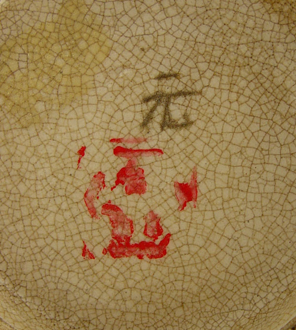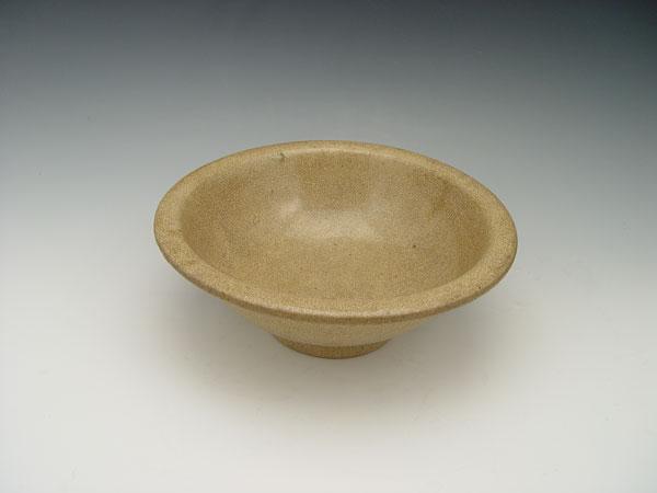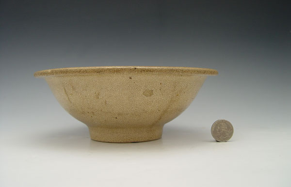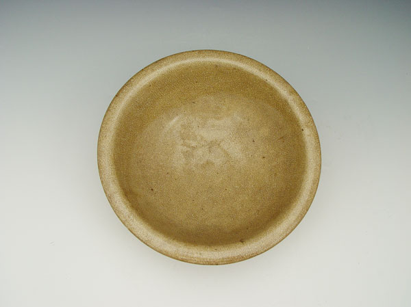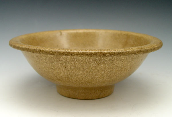 K'ANG HSI FISH ROE CRACKLE STONEWARE BOWL: Circa 1662-1722 A.D. pale brown ''fish roe'' crackle glazed stone ware bowl. One of several types of glazes, ''fish roe'' is one of the fine types. Signed on base. 3 1/4'' h. x 8 1/2'' dia. From the Estate of Dr. Arthur England, renowned author, lecturer and museum consultant.