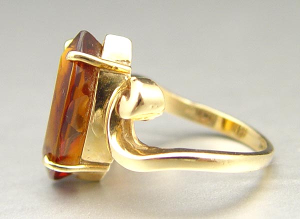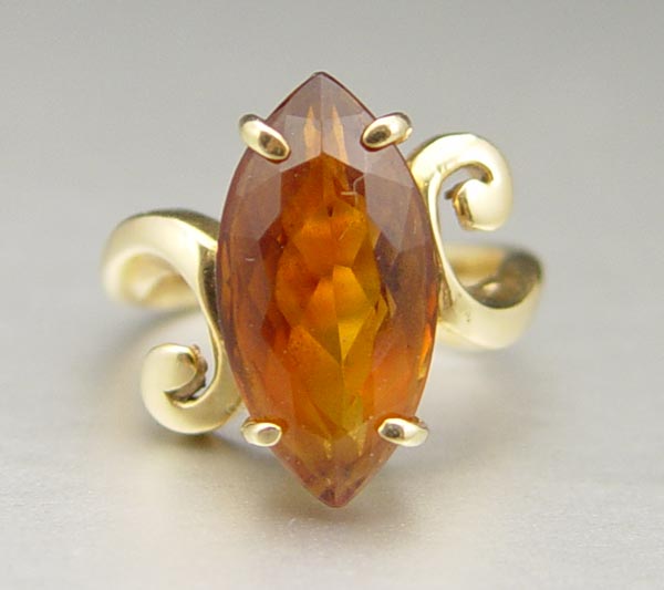14K CITRINE RING: 14K yellow gold ring contains one marquise cut citrine. Weight: 4.00 Ct. Approx. Madeira color. Prong set. Weight: 6.1 grams. Size: 7