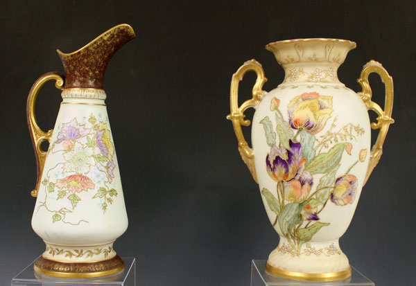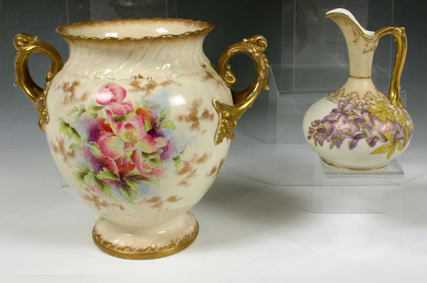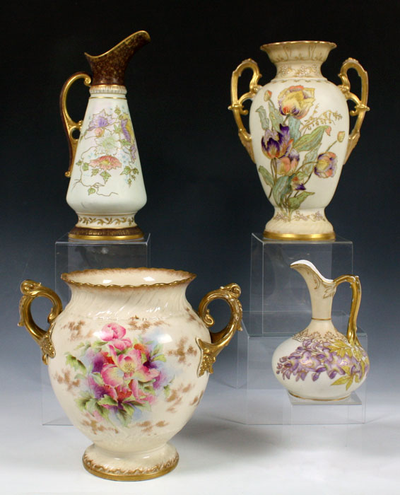 4 PIECE HAND PAINTED ROYAL WORCESTER TYPE PORCELAIN: The largest is Adderly, 11'' tall. The three unsigned pieces, urns and vase are 8 - 14'' tall. There is some wear to the gold.