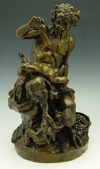 EARLY BRONZE SATYR WITH CHILDREN SCULPTURE: Late 19th/early 20th C., 13'' h., possibly after Clodion, exceptional detail.