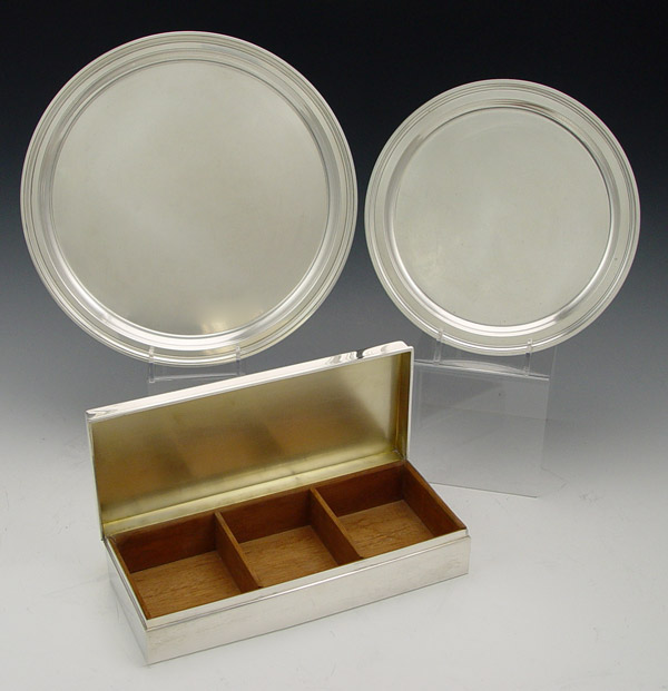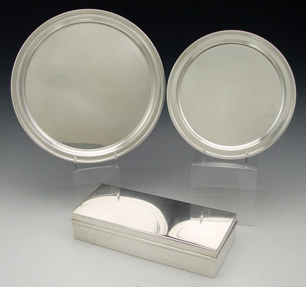 3 PIECE TIFFANY STERLING COLLECTION: To include 1) Hinged box with wood inserts, 23520. 2'' h x 9 1/2'' x 4''. Approx. 26 troy weighed with wood inserts. 2) Plate, 25011. 8'' dia. 3) Plate, 21252. 10'' dia. Plates weigh approx. 25.3 troy oz.