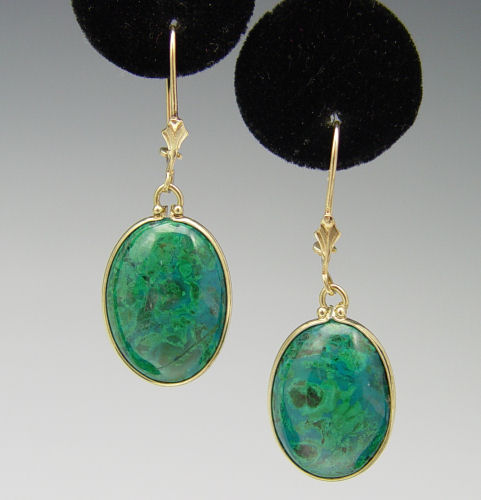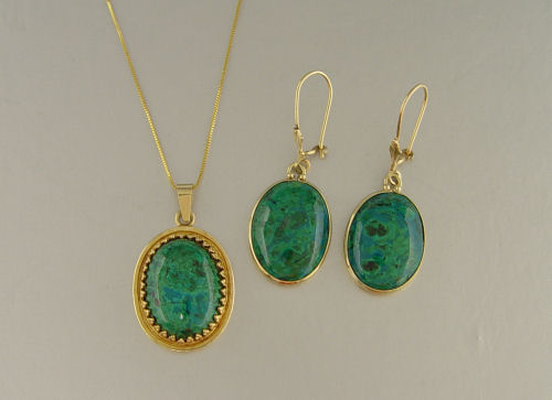 EGYPTIAN MALACHITE NECKLACE AND EARRINGS: 14K yellow gold necklace and earring set contains three 20.00 x 15.00 mm oval cabochon cut blue/green stones believed to be Egyptian malachite. n. The stones are bezel set. 14K yellow gold 24'' box chain. Gold Weight: 7.00 grams Approx.