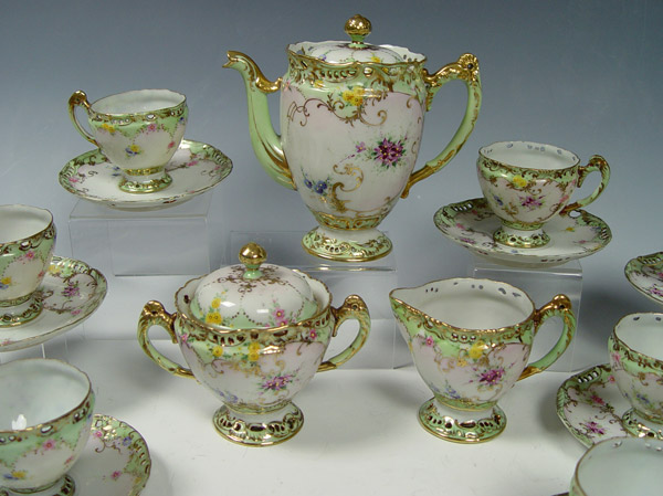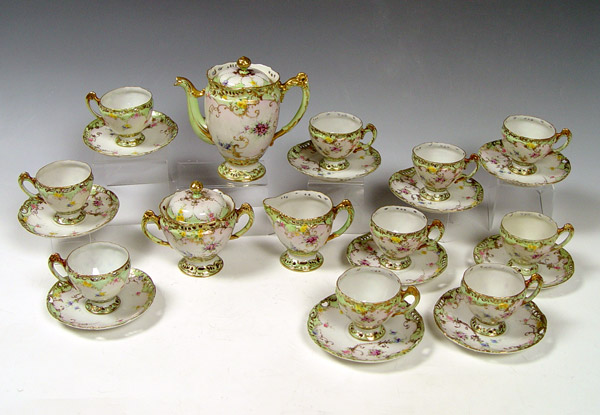 HAND PAINTED FRENCH PORCELAIN COFFEE SET: Petite coffee pot with creamer, sugar, 10 cups and saucers. Unmarked. Teapot is 6 1/2''tall and overall 7'' wide, saucer 5 1/4'' dia.