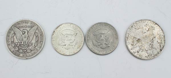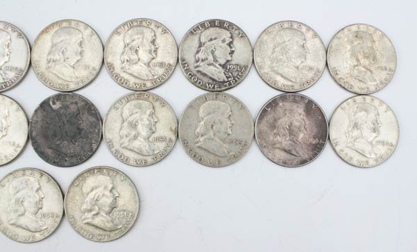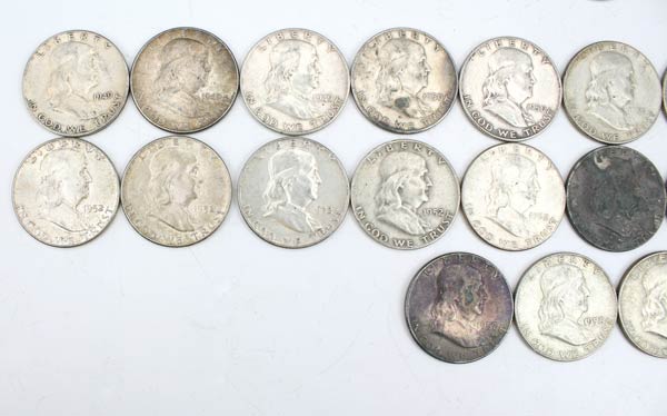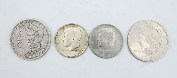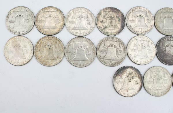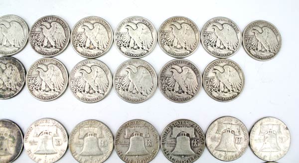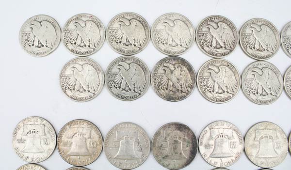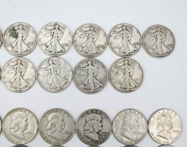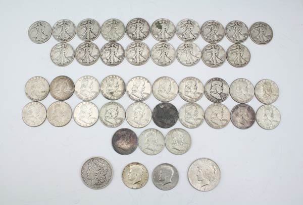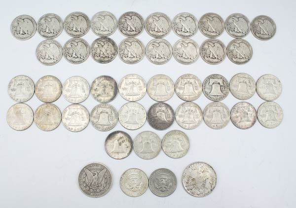 COLLECTION OF SILVER HALF DOLLARS & DOLLARS: To include 17 walking liberty half dollars, 1 1917, 1 1394, 1 1936, 1 1938, 1 1939, 2 1941, 3 1942, 2 1943, 1 1944, 3 1945, 1 1947. 23 Franklin half dollars, 3 1949, 2 1950, 4 1951, 6 1952, 2 1953, 3 1954, 1 1957, 2 1958. 2 1964 Kennedy half dollars. 1889 ''O'' Morgan dollar. 1924 Peace dollar. Ungraded. Approx 18.4 troy oz.