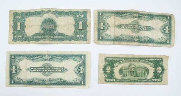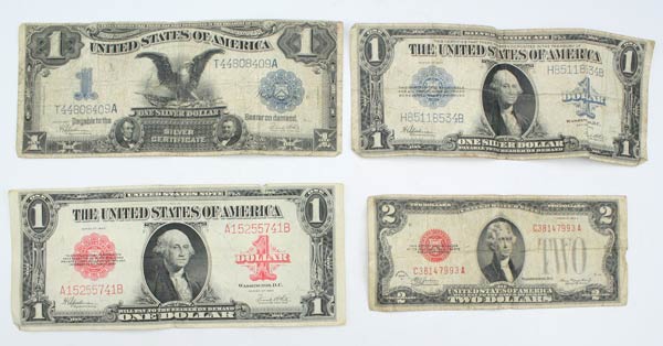 4 PIECE COLLECTION SILVER CERTIFICATES & NOTES: To include 1) 1923 large $1 Silver certificate. 2) 1923 large $1 US note. 3) 1899 large $1 Silver certificate. 4) 1928D $2 US note. Ungraded