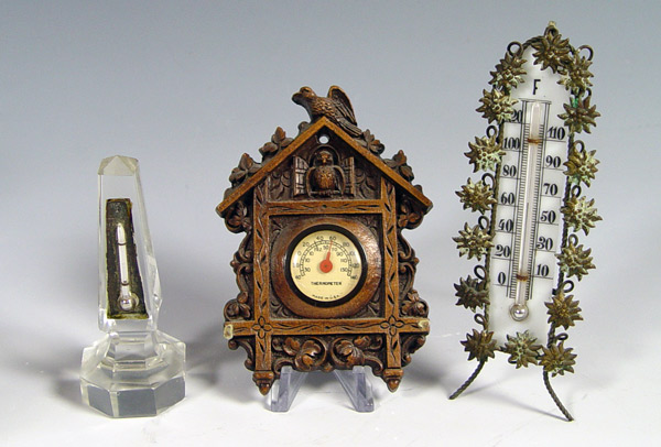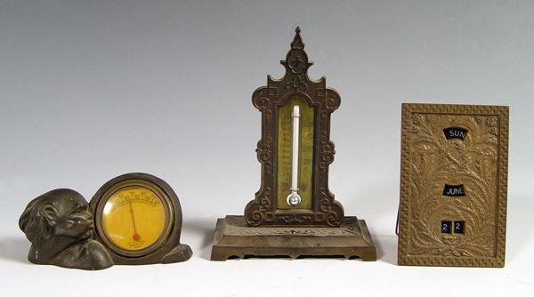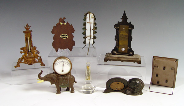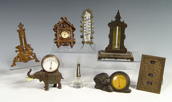 7 PIECE VINTAGE THERMOMETER COLLECTION: To include 1) Cast metal figural elephant with thermometer on back. 4 1/2'' x 4 3/4''. 2) Cast metal art nouveau with figure of turned head, illegibly signed on back, 2 1/2'' x 4 3/4'' 3) Cast metal architectural form, 6 1/2'' h. x 4 3/4''. 4) Cast metal easel back with cherubs and masqueron, 5 3/4'' h x. 4''. 5) Carved wood cuckoo clock form from SyrocoWood, 4 1/2'' x 2 7/8'', note glue spots. 6) Metal floral with easel back, porcelain body. 5 1/2'' x 2''. 7) Crystal obelisk, 3 3/4'' h x 1 1/2'', note scratches, finish on faceplate. Sold with cast metal thistle design perpetual desk calendar, 4 1/2'' h x 3'', note month is stuck on June.