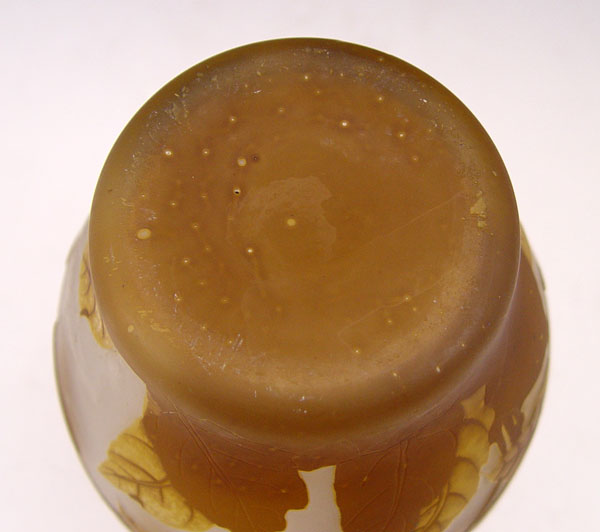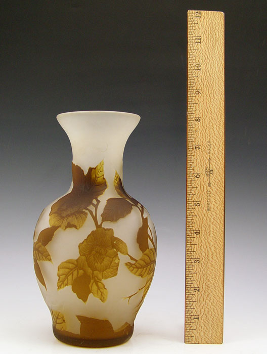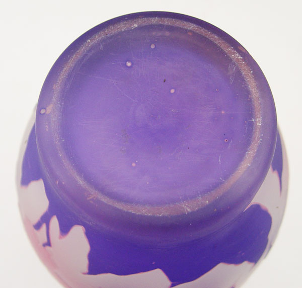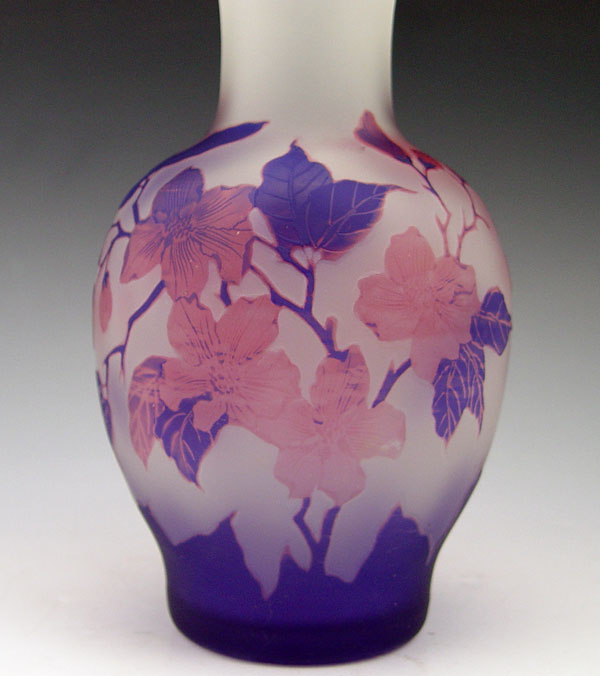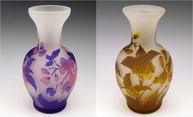 TWO CONTEMPORARY CAMEO GLASS VASES: Shades of purple cut to pink and shades of brown cut to amber. Each 8 1/2'' tall.